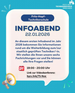 Informieren Sie sich heute, 22.01.2026, um 19:00 Uhr in einer Videokonferenz direkt über unsere sechs Fachrichtungen, die Voraussetzungen für eine erfolgreiche Weiterbildung und erhalten Sie Infos zum Start im September 2026.