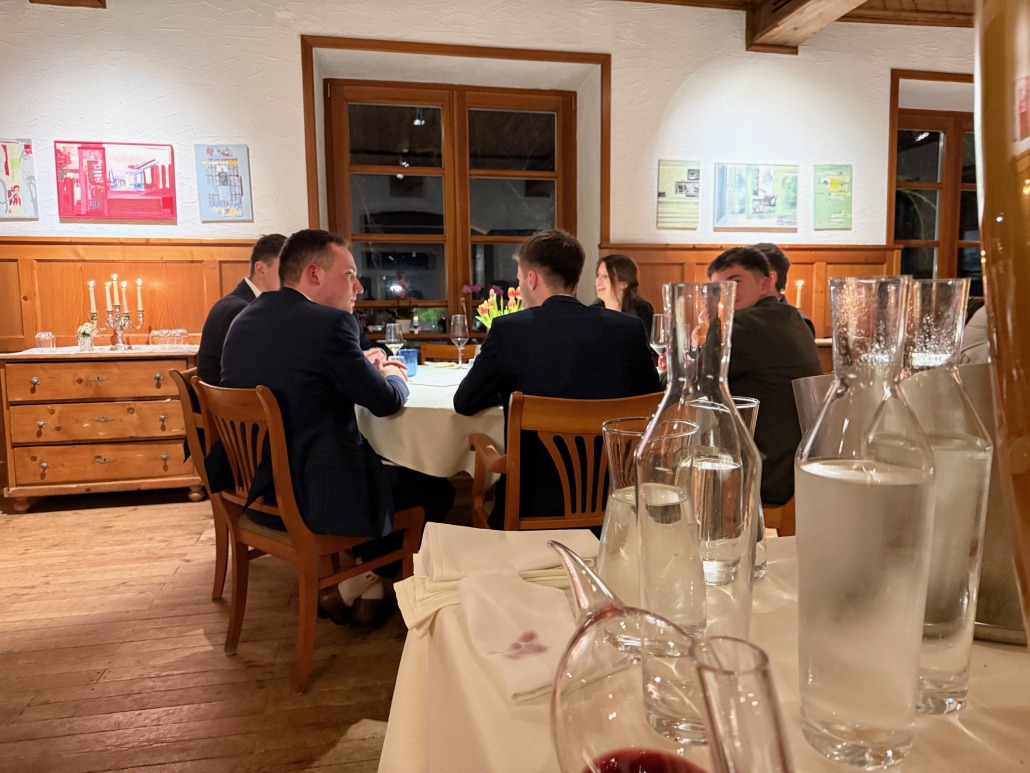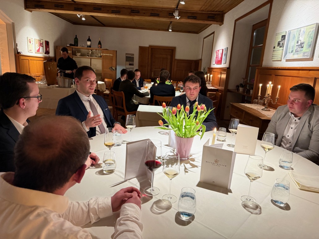Erst danach nahmen wir an den festlich gedeckten Tischen Platz, um uns das Menü schmecken zu lassen. Das Team rund um Jockl Kaiser war dabei ein super Gastgeber. Sie haben uns auf eine lockere, aber professionelle Art gezeigt, dass man vor einem edlen Menü und ungewohnt viel Besteck absolut keine Panik haben muss. Es war ein rundum gelungener Abend, der uns bestens auf zukünftige Einsätze auf dem gesellschaftlichen Parkett vorbereitet.